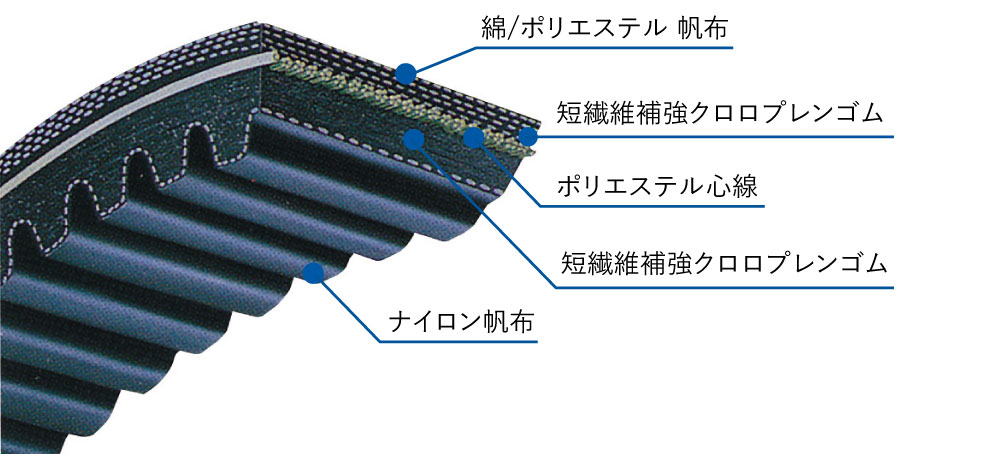 本体に短繊維で補強されたクロロプレンゴムやEPDMゴムを用い、心線にはポリエステルコードやアラミドコードが使用されています。