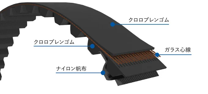 ゴム製タイミングベルトの心線には通常ガラスファイバーコード、歯ゴムには機械的強度の高いクロロプレンゴムが使用されており、ベルト歯面は耐摩耗性に優れたナイロン帆布で保護されています。
