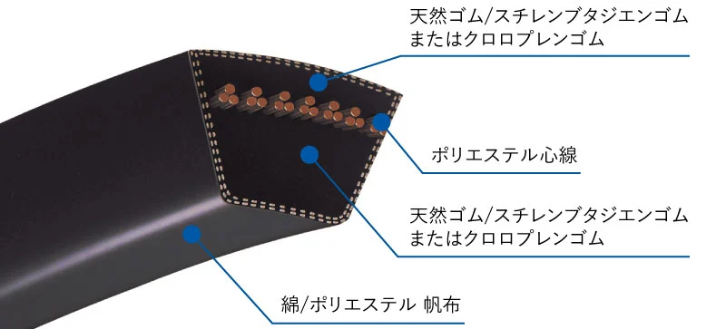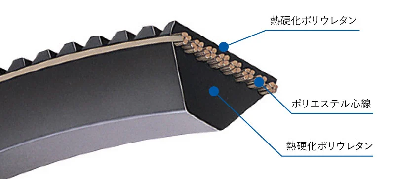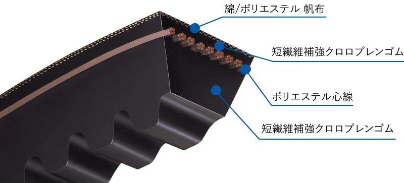 心線には主にポリエステル繊維が用いられますが、特に高負荷を伝える必要がある用途ではアラミドコードを用いた製品も多く使用されています。