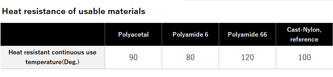 ・The use of heat-resistant engineering plastic enables use in high-temperature ranges that cannot be handled by cast nylon.