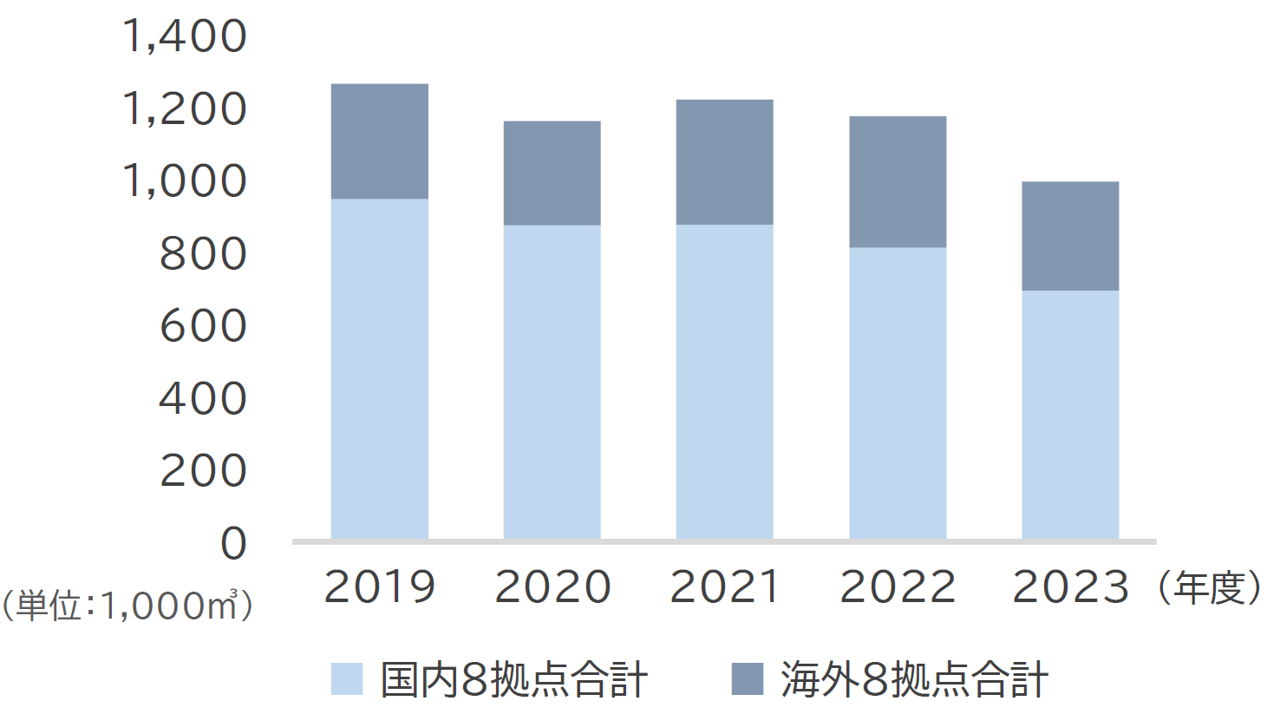 2024年度の国内拠点の取水量は、名古屋工場において「冷却水循環システム」の導入、全拠点で水消費効率の改善を進めた結果、744,795㎥(2021年度比 ▲15.1%)となりました。海外拠点の取水量原単位は、全拠点で水消費効率の改善を進めた結果、15.18㎥/t(2021年度取水量原単位:16.77㎥/t)となりました。