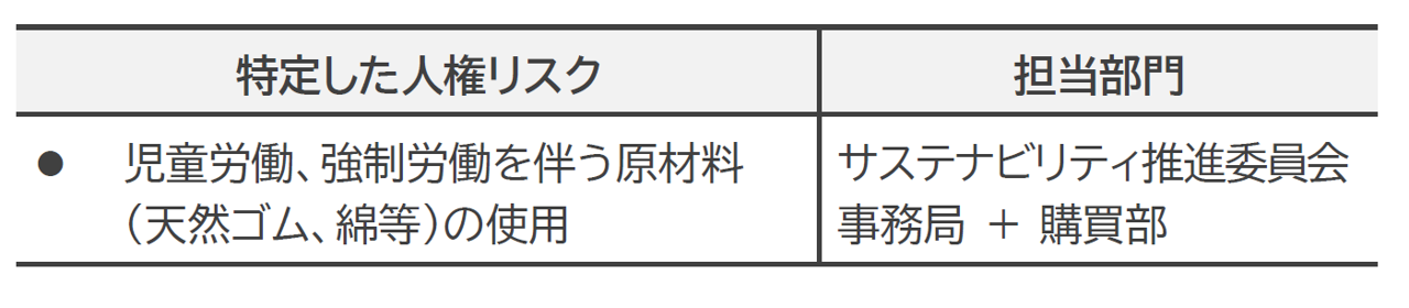 | 児童労働、強制労働を伴う原材料(天然ゴム、綿等)の使用 | サステナビリティ会議事務局+購買部 |